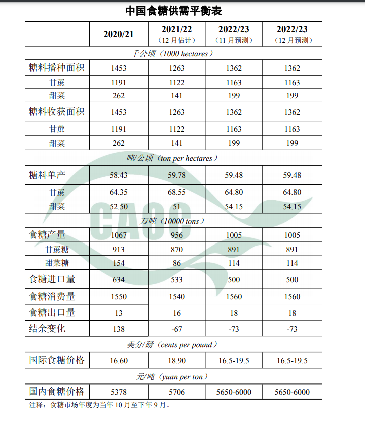 本月对2021/22年度估计数据进行校准。2021/22年度,全国糖料种植面积1263千公顷,甘蔗种植面积1122千公顷,甜菜种植面积141千公顷;甘蔗单产68.55吨/公顷,甜菜单产51吨/公顷。