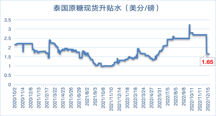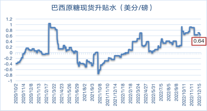 12月第三周巴西港口糖排船量回落,本周巴西原糖(VHP)现货对纽约原糖3月合约升水(1月船期)小幅回调至64个点,泰国原糖(Hipol)对纽约3月合约价格升水持平于上周的165个点,预计泰国新糖供应继续延迟以及印度减产变数将对现货升水形成支撑。