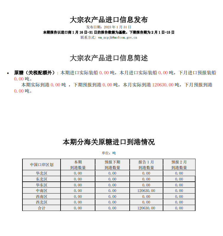 商务部 :1月关税配额外原糖实际到港12万吨 下月预报到港0吨