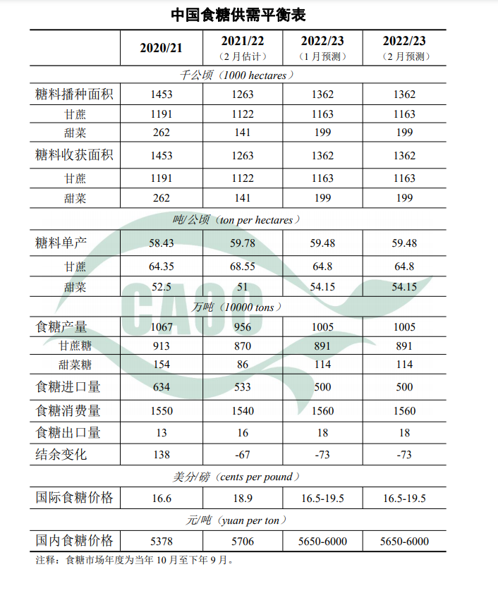 本月对2022/23年度预测数据不作调整。截至1月底,北方甜菜糖生产已近尾声,南方甘蔗糖生产进入高峰。据中国糖业协会统计,截至1月末,2022/23年度全国累计产糖566万吨,同比增加34万吨,增幅6.4%;累计销糖237万吨,同比增加27万吨,增幅12.9%;累计销糖率41.8%,比上年同期加快2.3个百分点。随着学校开学、企业全面复工,将有利于拉动食糖消费。国际方面,2月初印度下调本年度食糖产量,巴西终止乙醇进口免税政策导致糖厂倾向于减少食糖生产,支撑国际糖价走高,但多家国际机构预测本年度食糖产大于需。后期,需关注主产省(区)生产进度和印度食糖产量是否出现超预期下降。