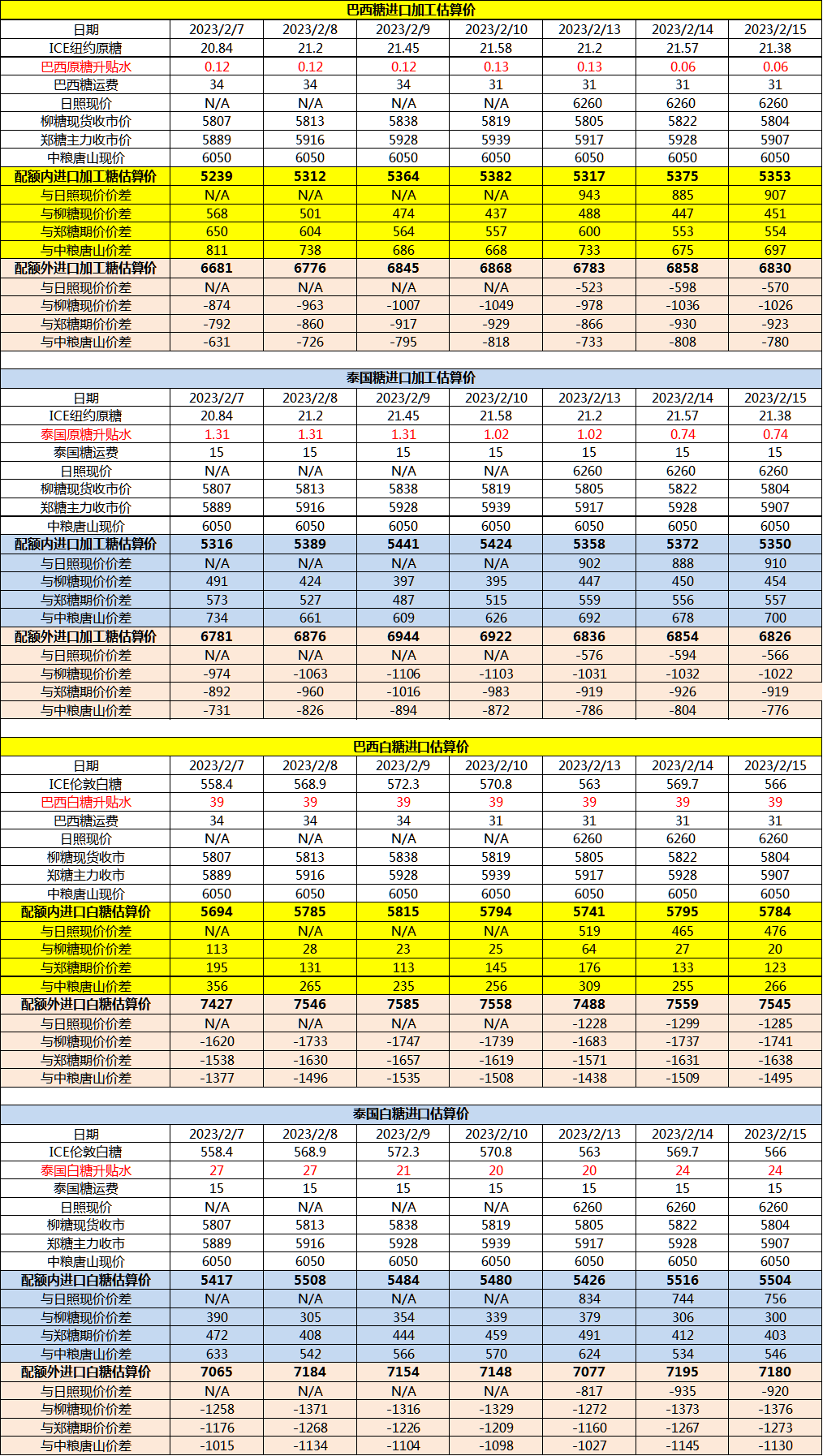 2月15日巴西泰国进口糖升贴水、运费及加工成本