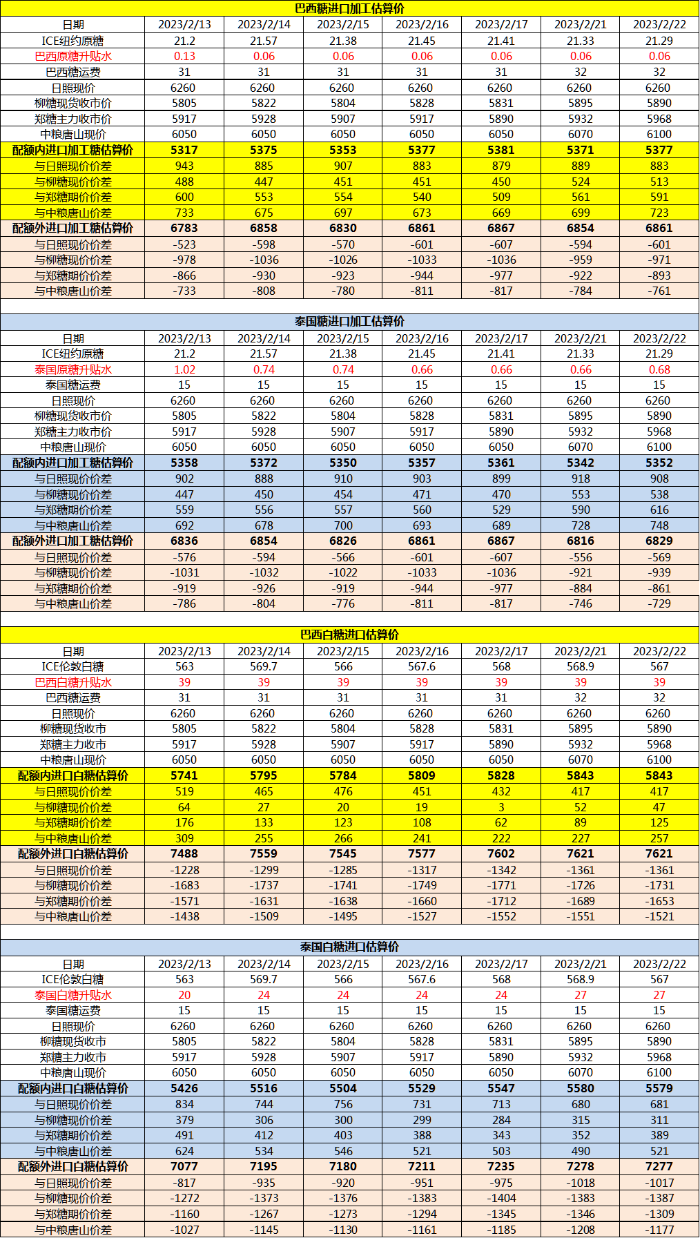 2月22日巴西泰国进口糖升贴水、运费及加工成本