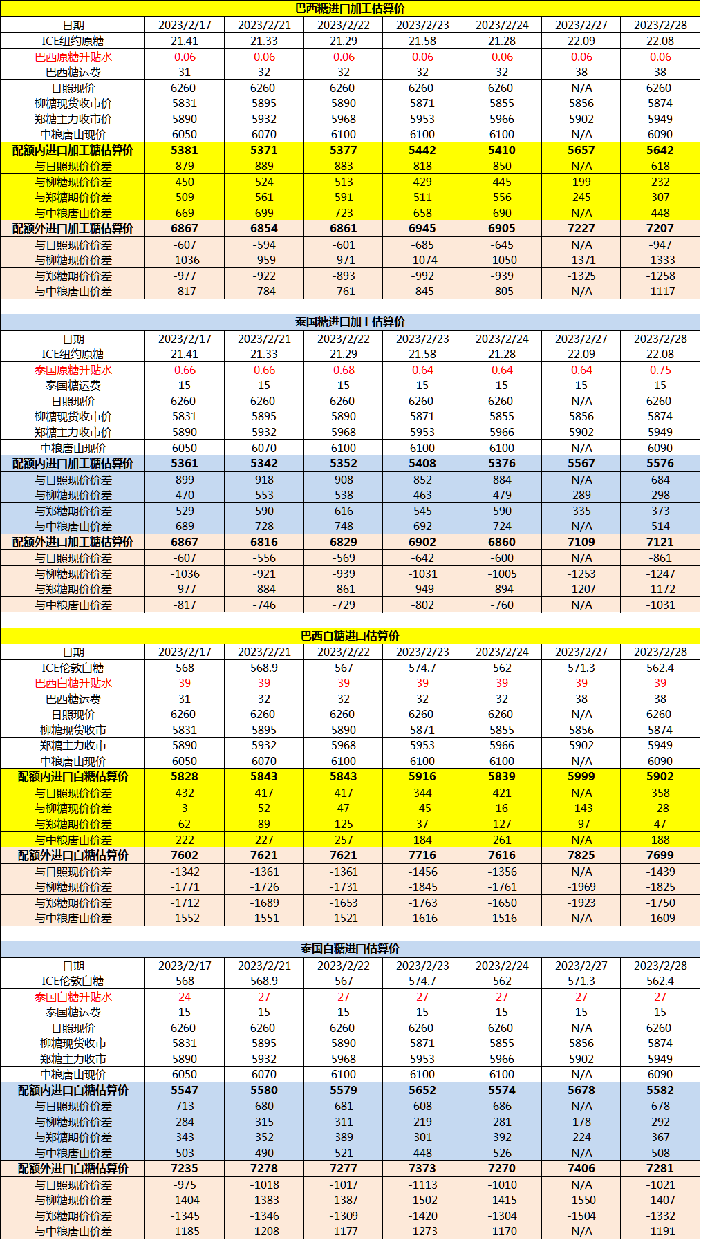 2月28日巴西泰国进口糖升贴水、运费及加工成本