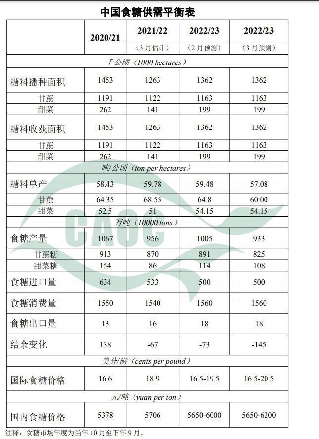 本月对2022/23年度食糖生产及价格预测数据进行调整。北方甜菜糖厂已全部收榨,本月将甜菜糖产量下调6万吨,至108万吨。南方除云南甘蔗糖厂正处于生产旺季,其他产区陆续收榨。由于广西前期受不利天气影响,甘蔗单产降幅高于预期。本月将甘蔗单产下调4.8吨/公顷,至60吨/公顷,甘蔗糖产量下调66万吨,至825万吨,食糖总产量下调72万吨,至933万吨。