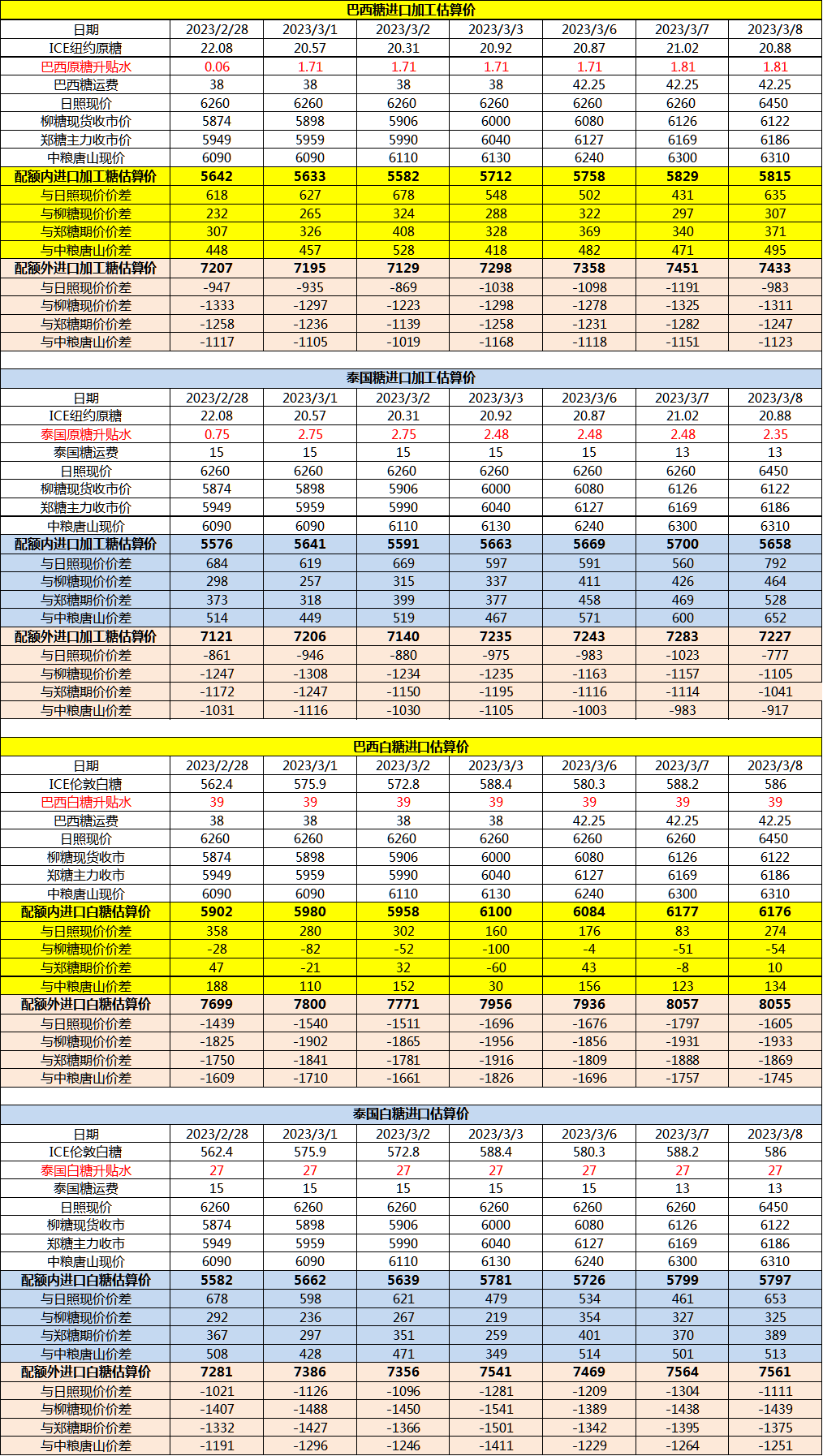 3月8日巴西泰国进口糖升贴水、运费及加工成本