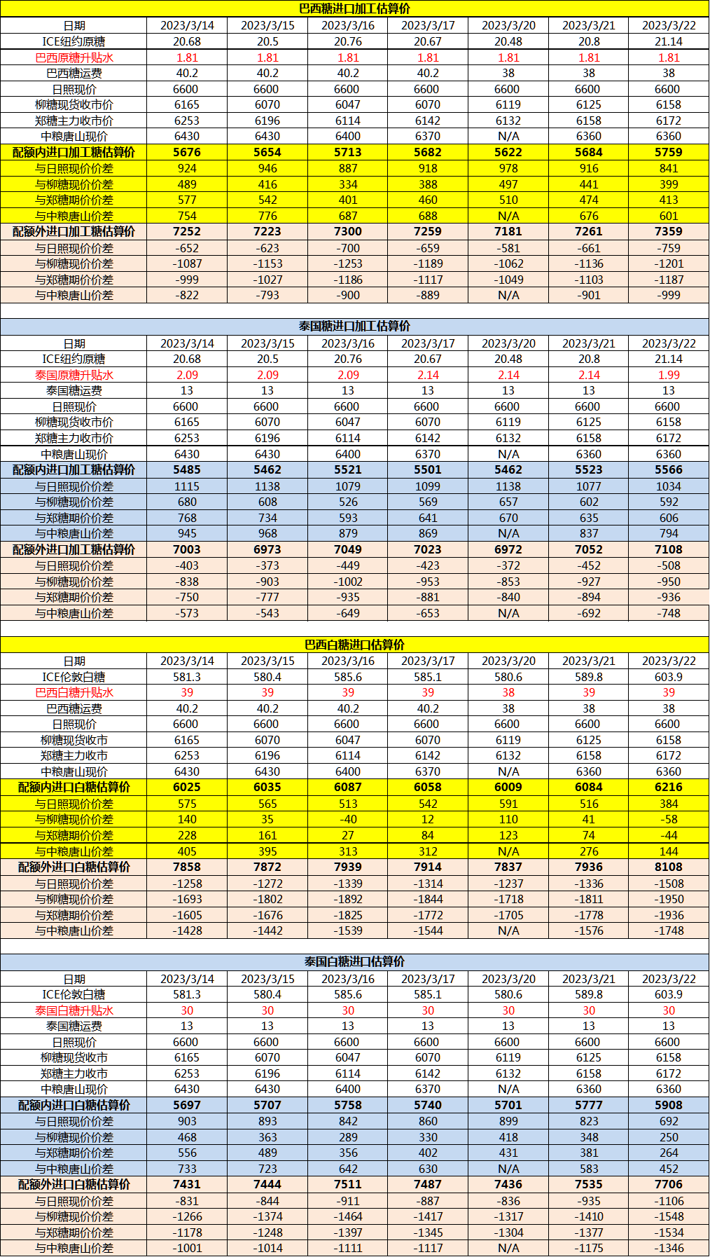 3月22日巴西泰国进口糖升贴水、运费及加工成本
