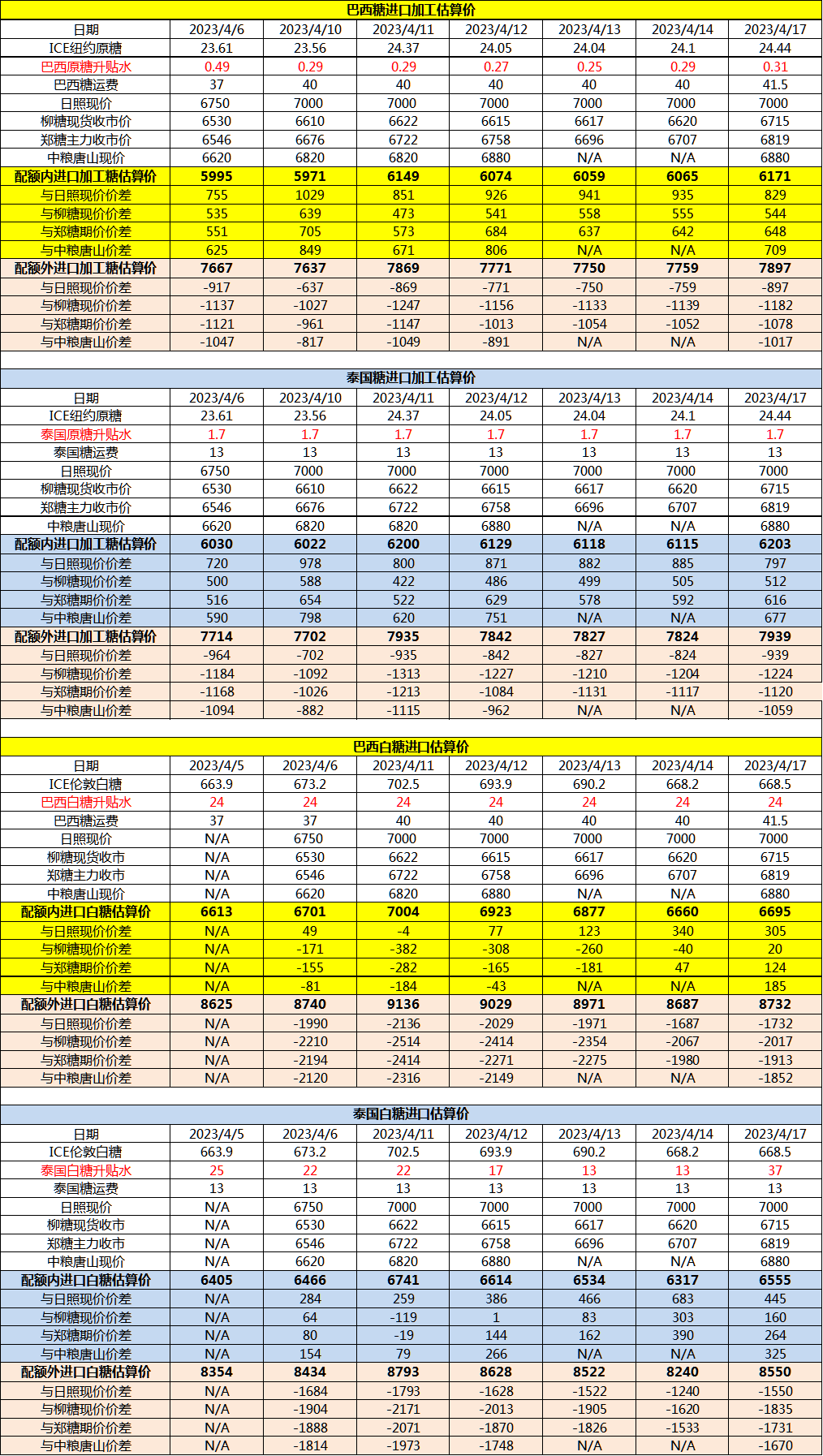 4月17日巴西泰国进口糖升贴水、运费及加工成本