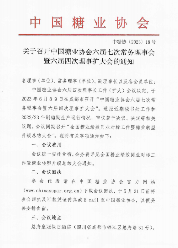 关于召开中糖协六届七次常务理事会暨六届四次理事扩大会的通知 作者: 来源:中糖协 2023年4月28日 14:03 阅读(102) 评论关闭 声明: 云南国际食糖交易中心网站及沐甜科技致力于保护作者版权。本网站部分文章和信息来系转载或引用,目的在于传播更多信息,并不意味着赞同其观点或证实其内容。如转载稿涉及版权等问题,请及时联系 0871 - 64587901,本网站会予以更改或删除相关内容,保障您的权利。