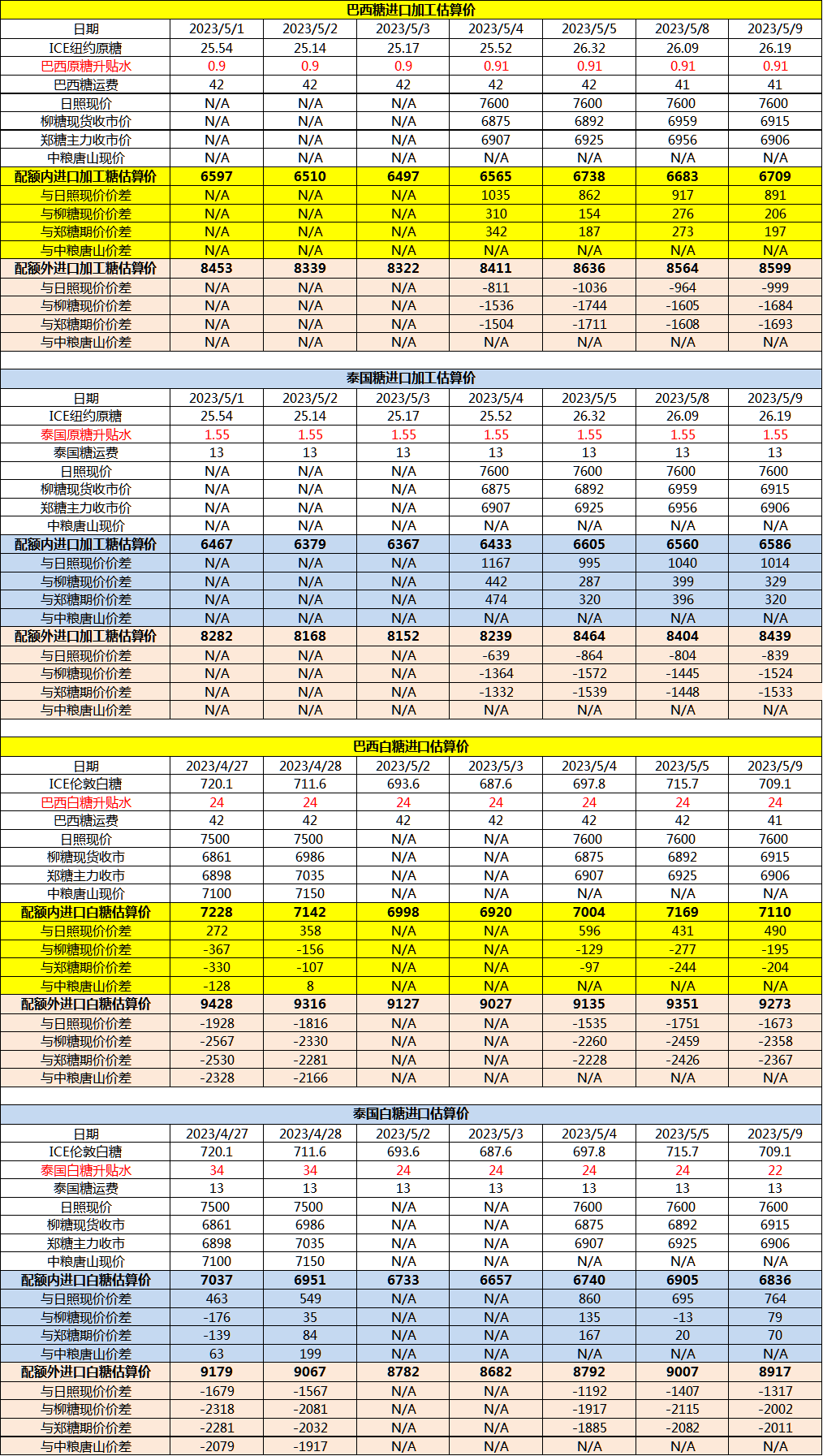 5月9日巴西泰国进口糖升贴水、运费及加工成本