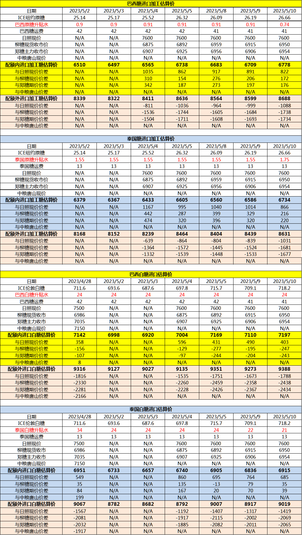 5月10日巴西泰国进口糖升贴水、运费及加工成本