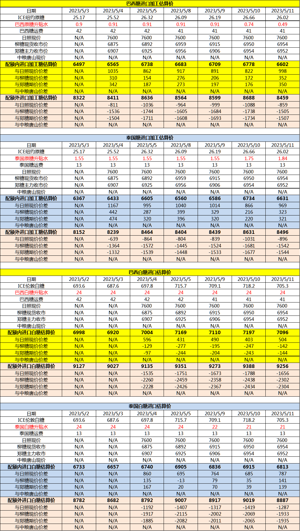 5月11日巴西泰国进口糖升贴水、运费及加工成本