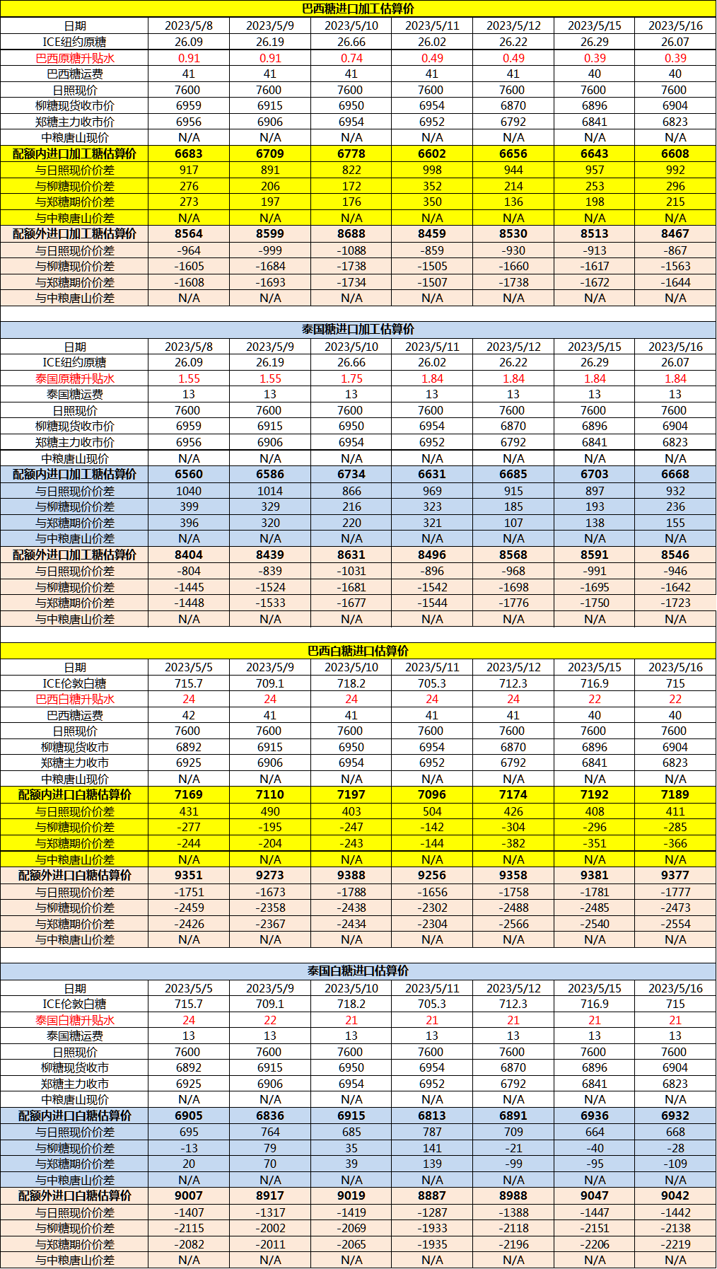 5月16日巴西泰国进口糖升贴水、运费及加工成本