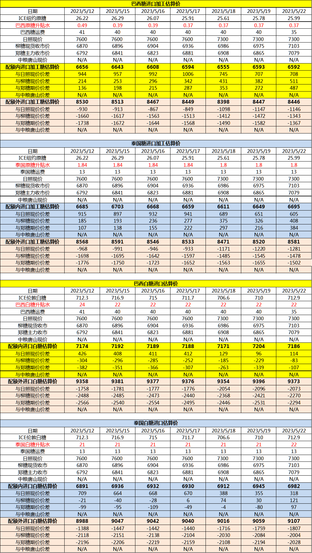 5月22日巴西泰国进口糖升贴水、运费及加工成本