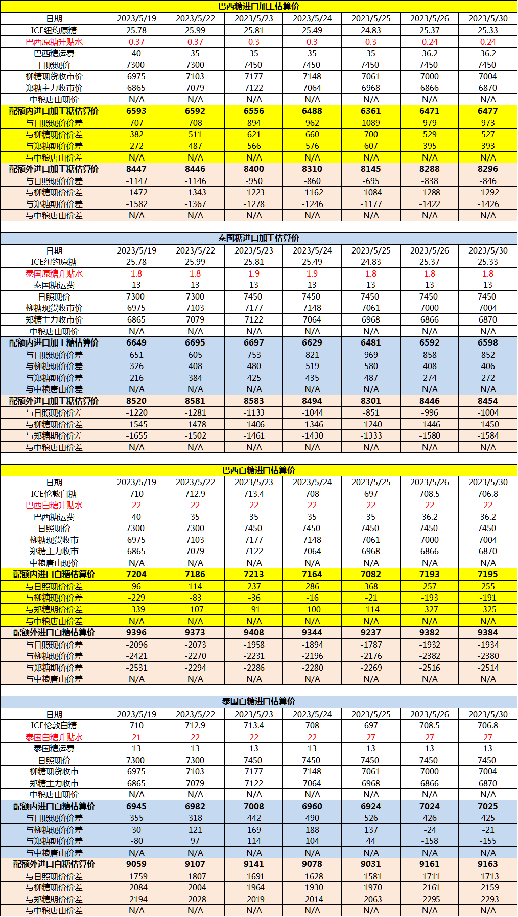5月30日巴西泰国进口糖升贴水、运费及加工成本