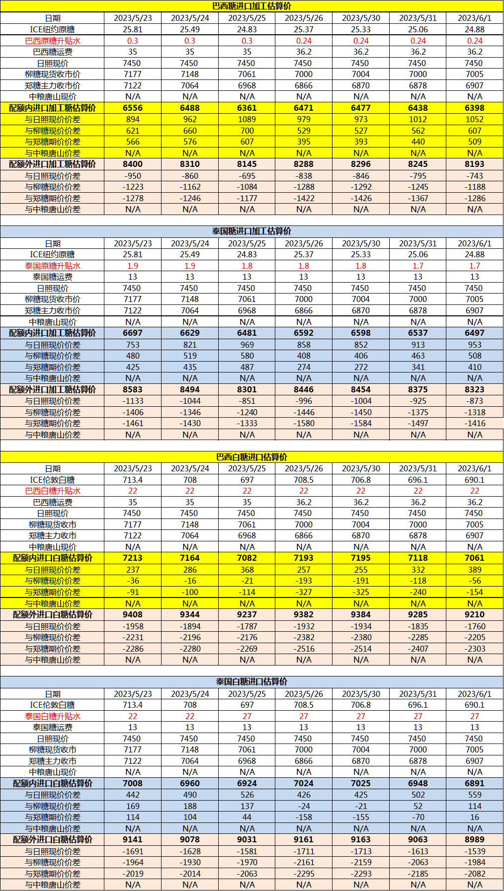 6月1日巴西泰国进口糖升贴水、运费及加工成本