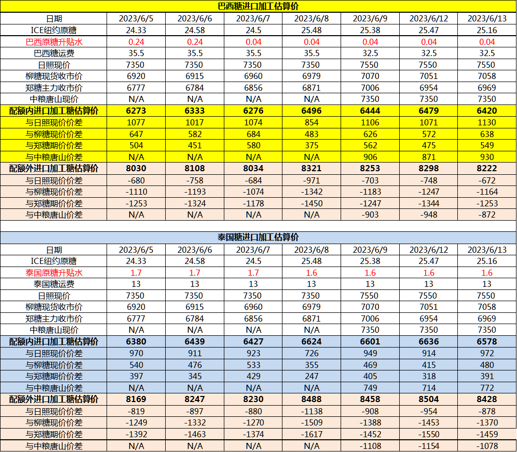 6月13日巴西泰国进口糖升贴水、运费及加工成本