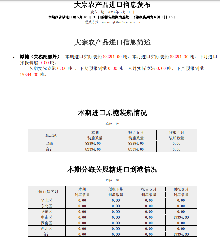 商务部 :5月关税配额外原糖实际到港0吨 下月预报到港约2万吨