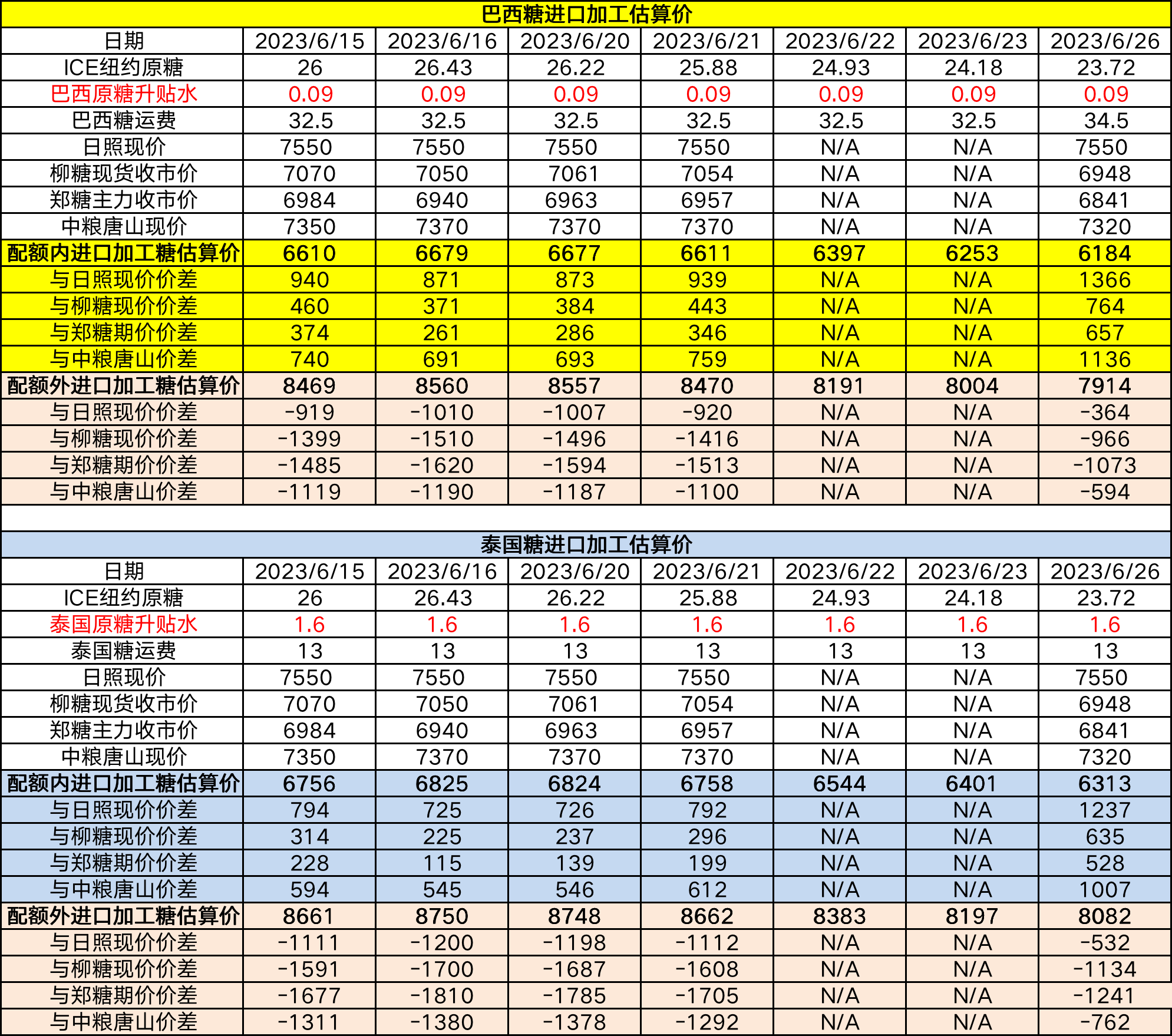 6月26日巴西泰国进口糖升贴水、运费及加工成本