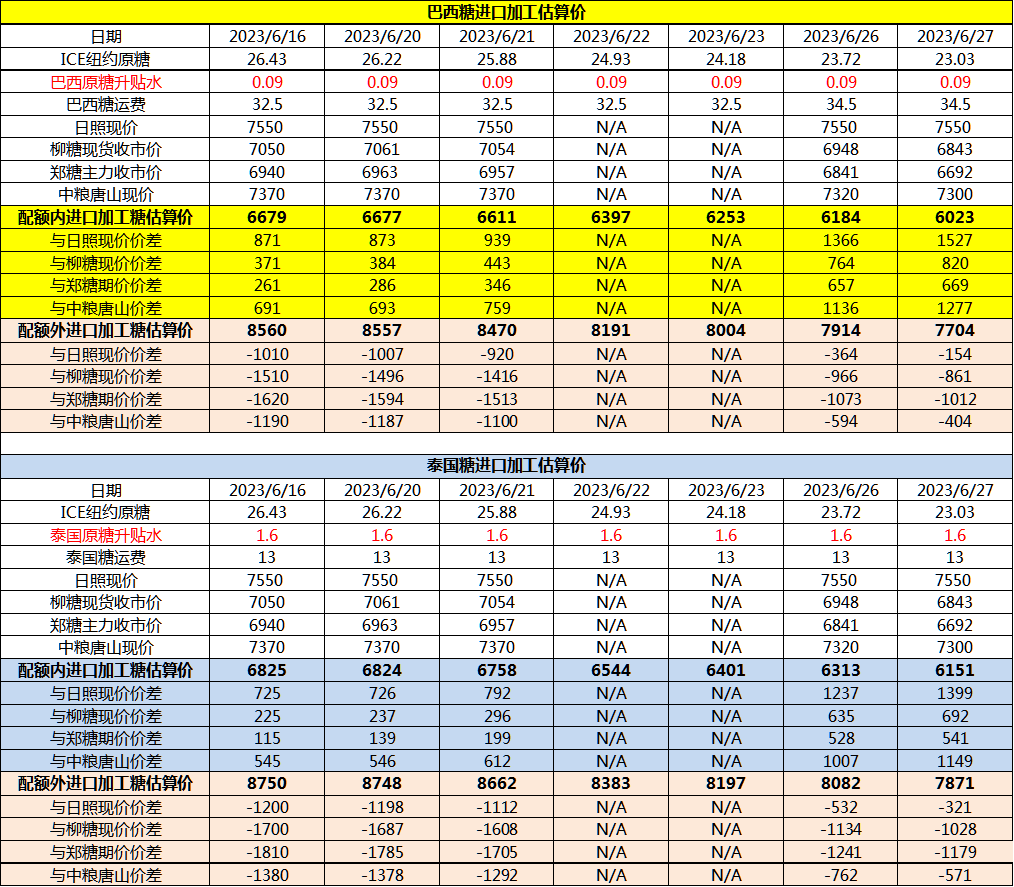 6月27日巴西泰国进口糖升贴水、运费及加工成本