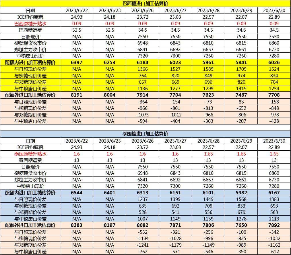 6月30日巴西泰国进口糖升贴水、运费及加工成本