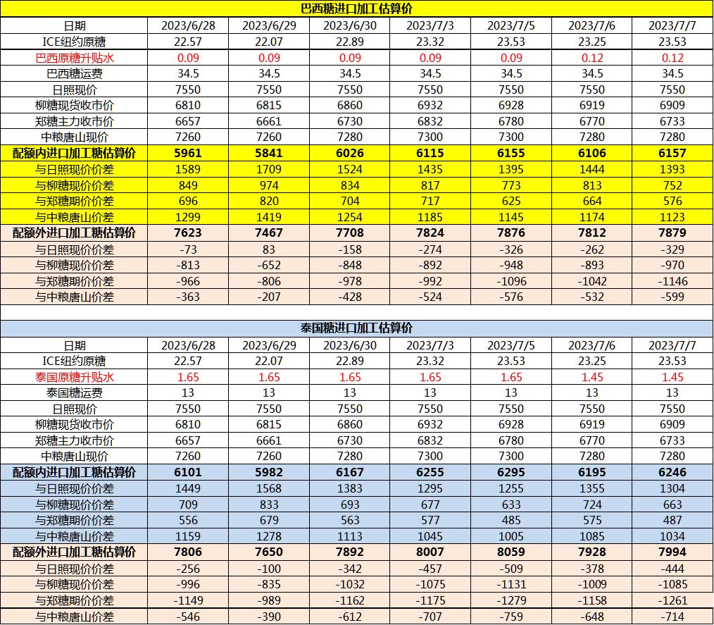 7月7日巴西泰国进口糖升贴水、运费及加工成本