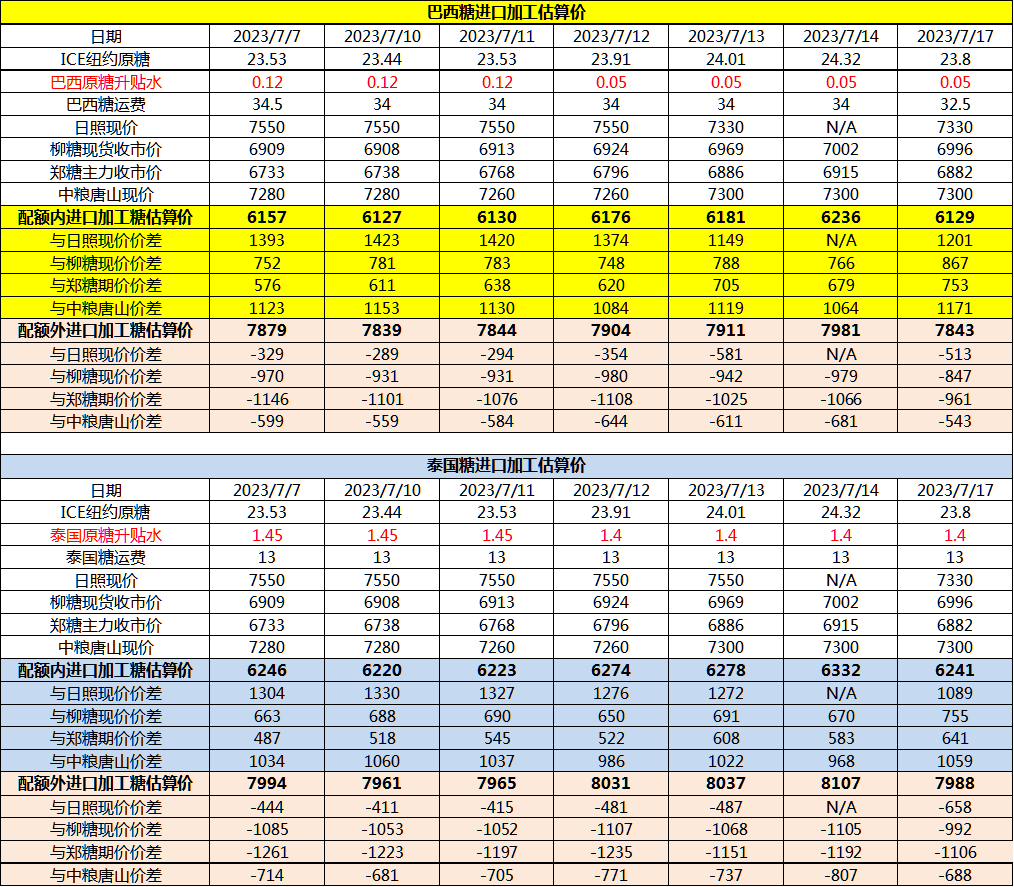 7月17日巴西泰国进口糖升贴水、运费及加工成本