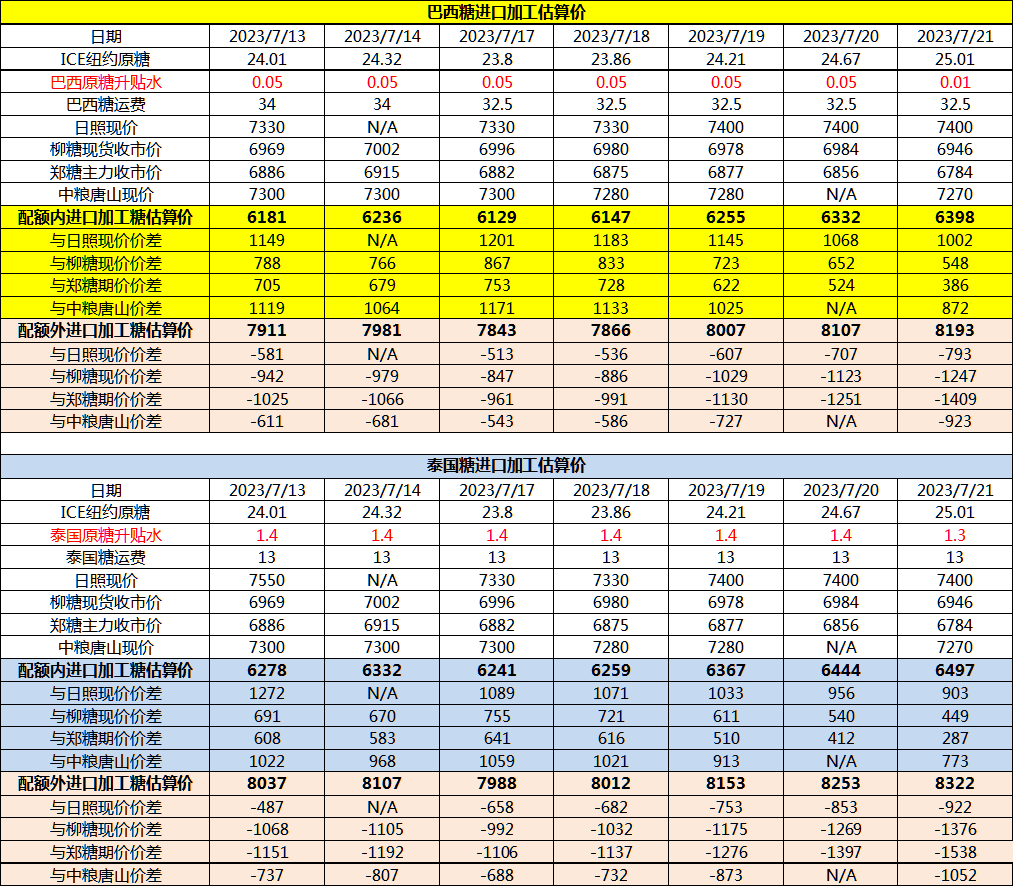 7月21日巴西泰国进口糖升贴水、运费及加工成本