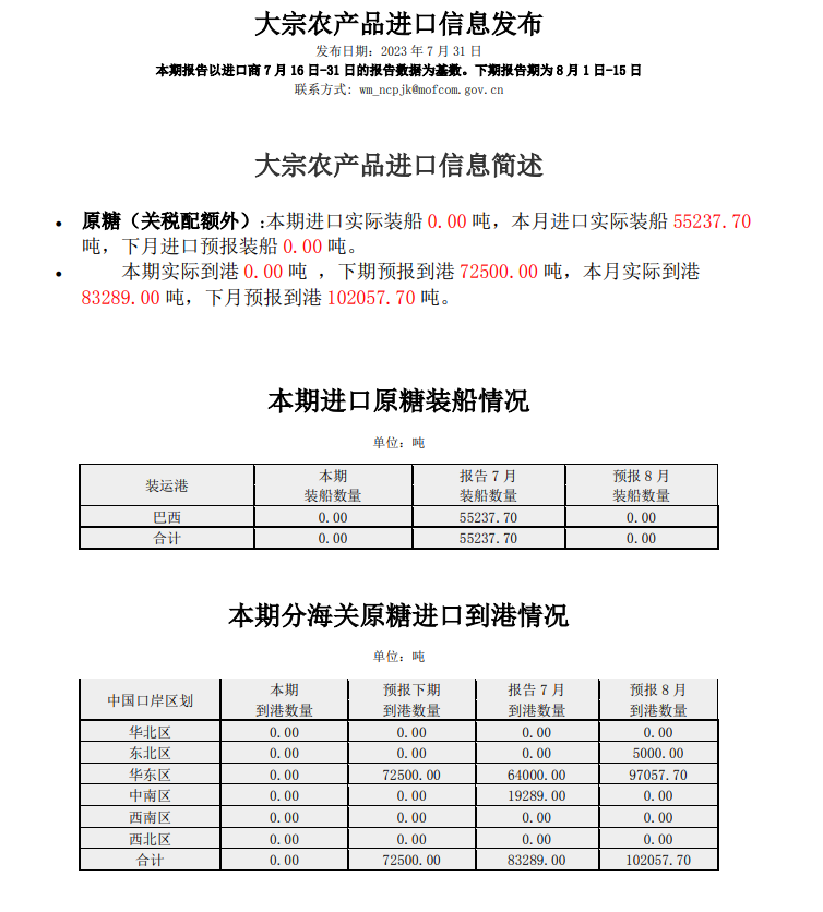 商务部 :7月关税配额外原糖实际到港8.33万吨 下月预报到港10.21万吨