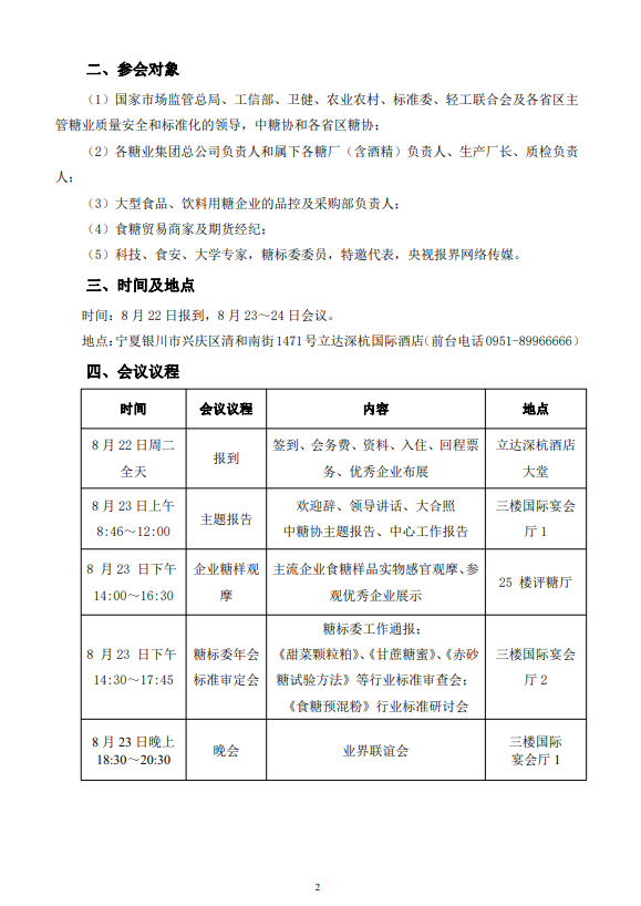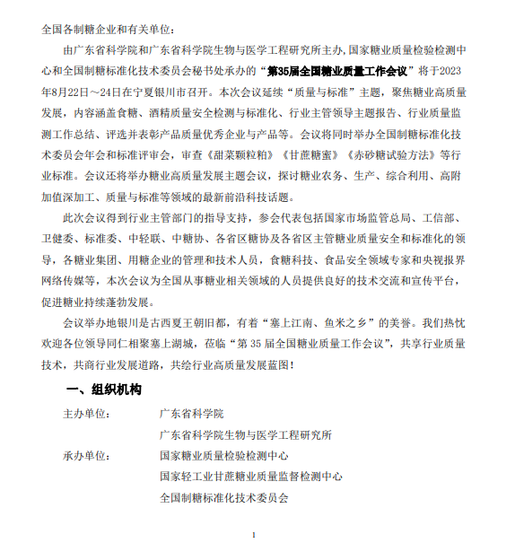 关于召开第三十五届全国糖业质量工作会议的通知 作者: 来源: 2023年8月9日 10:19 阅读(25) 评论关闭 声明: 云南国际食糖交易中心网站及沐甜科技致力于保护作者版权。本网站部分文章和信息来系转载或引用,目的在于传播更多信息,并不意味着赞同其观点或证实其内容。如转载稿涉及版权等问题,请及时联系 0871 - 64587901,本网站会予以更改或删除相关内容,保障您的权利。