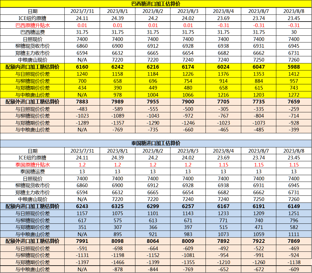 8月8日巴西泰国进口糖升贴水、运费及加工成本