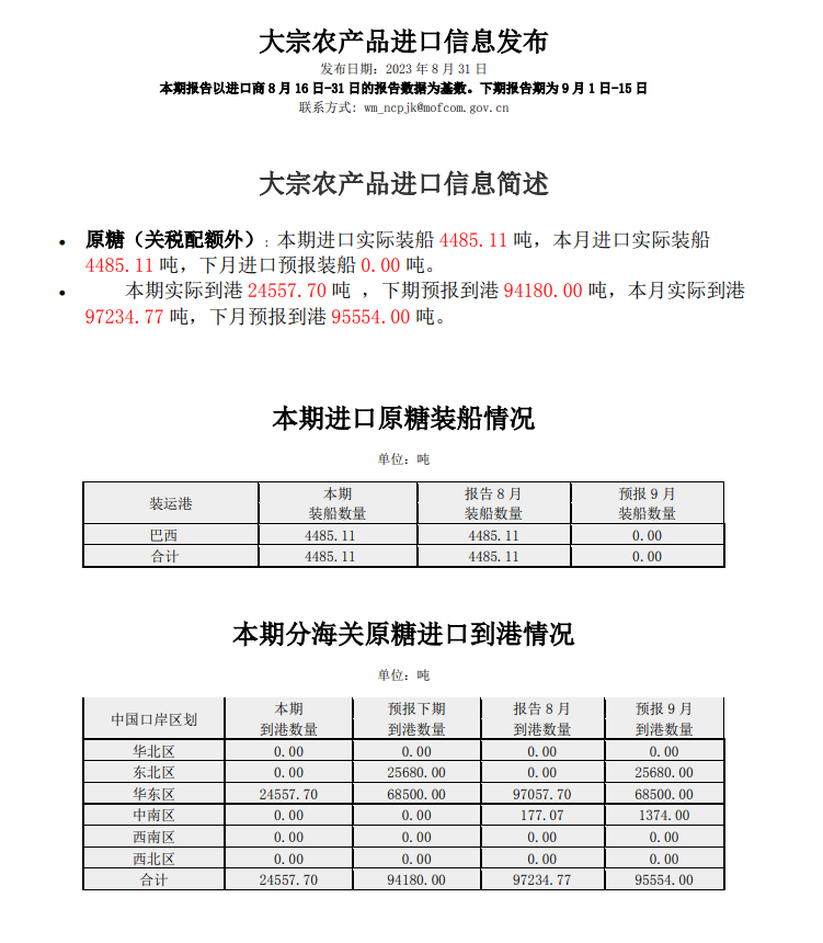 商务部 :8月关税配额外原糖实际到港9.72万吨 下月预报到港9.56万吨