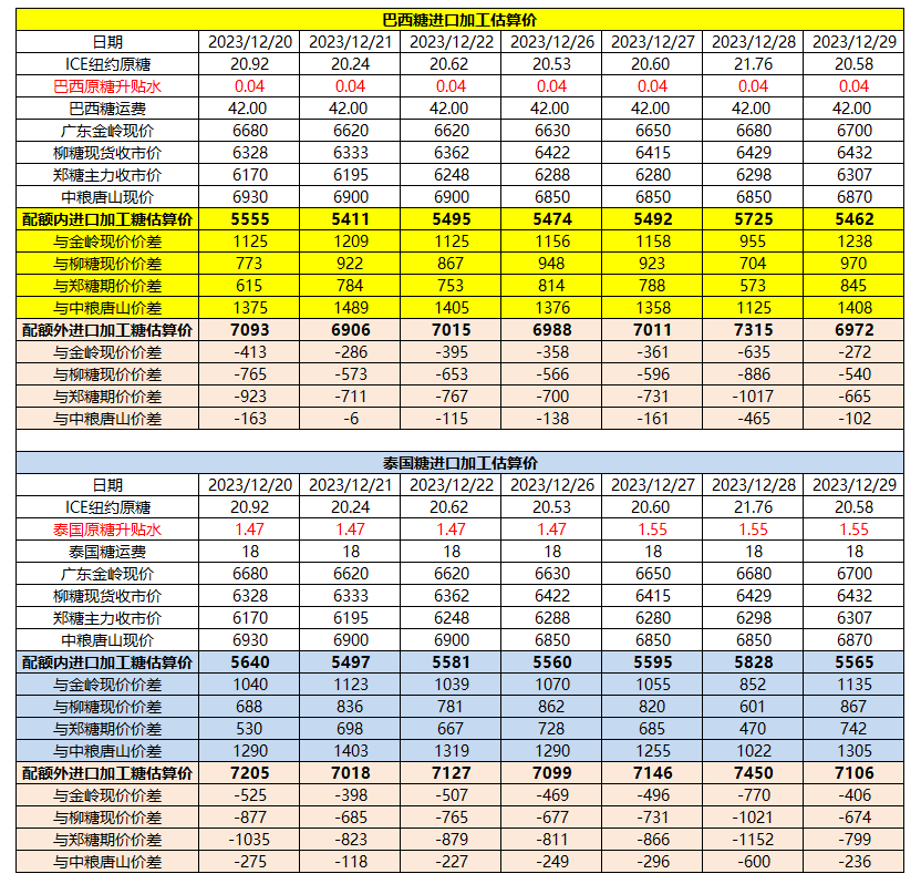 12月29日巴西泰国进口糖升贴水、运费及加工成本