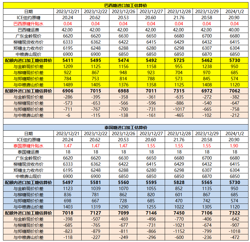 1月2日巴西泰国进口糖升贴水、运费及加工成本