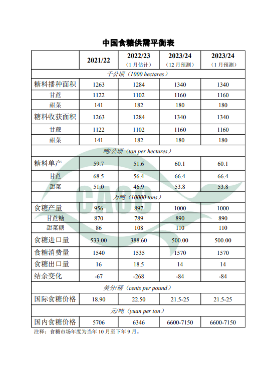 本月对2023/24年度预测数据不作调整。北方甜菜糖生产接近尾声,南方甘蔗糖生产进入旺季,甘蔗砍收、入榨总体正常。据中国糖业协会统计,截至2023年12月底,2023/24年度全国累计产糖320万吨,较上年度减6万吨;累计销糖170万吨,较上年度增20万吨;累计销糖率53.2%,较上年度增7.2个百分点。目前,新糖集中上市,国内糖价走势偏弱。天气预报显示,未来广西主产区大部平均气温偏低、降水偏多,有阶段性雨雪冰冻天气风险,不利于甘蔗砍收入榨。国际方面,截至2023年12月底,巴西大幅增产,印度、泰国略有减产,国际食糖产需预期总体趋于好转,后期需关注巴西出口进度、印度和泰国产糖进度及其出口政策的调整。