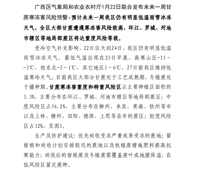 广西甘蔗寒冻害气象灾害风险预警 作者: 来源:广西气象局 2024年1月22日 16:11 阅读(26) 评论关闭 声明: 云南国际食糖交易中心网站及沐甜科技致力于保护作者版权。本网站部分文章和信息来系转载或引用,目的在于传播更多信息,并不意味着赞同其观点或证实其内容。如转载稿涉及版权等问题,请及时联系 0871 - 64587901,本网站会予以更改或删除相关内容,保障您的权利。