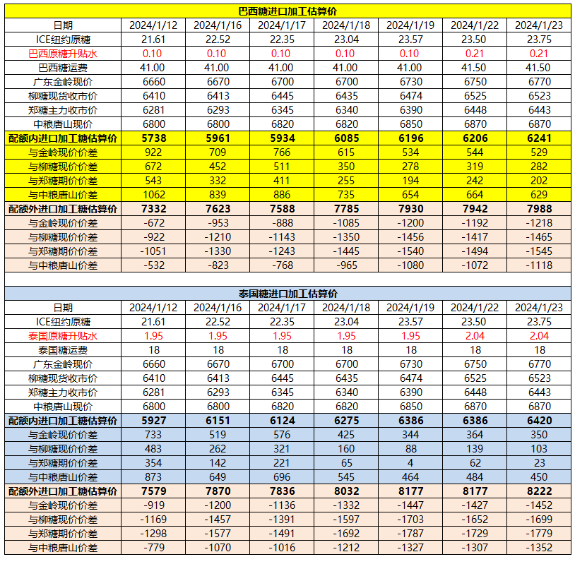 1月23日巴西泰国进口糖升贴水、运费及加工成本