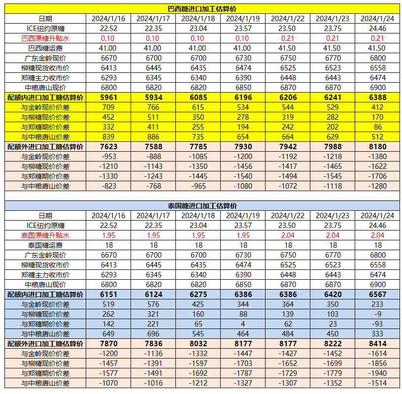 1月24日巴西泰国进口糖升贴水、运费及加工成本