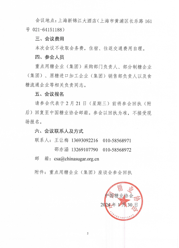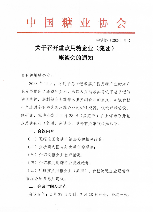关于召开重点用糖企业(集团)座谈会的通知 作者: 来源:中糖协 2024年1月30日 17:29 阅读(22) 评论关闭 声明: 云南国际食糖交易中心网站及沐甜科技致力于保护作者版权。本网站部分文章和信息来系转载或引用,目的在于传播更多信息,并不意味着赞同其观点或证实其内容。如转载稿涉及版权等问题,请及时联系 0871 - 64587901,本网站会予以更改或删除相关内容,保障您的权利。