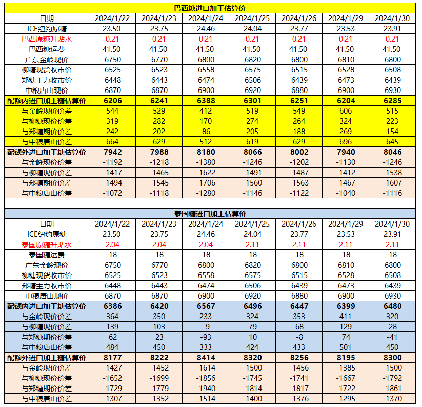 1月30日巴西泰国进口糖升贴水、运费及加工成本