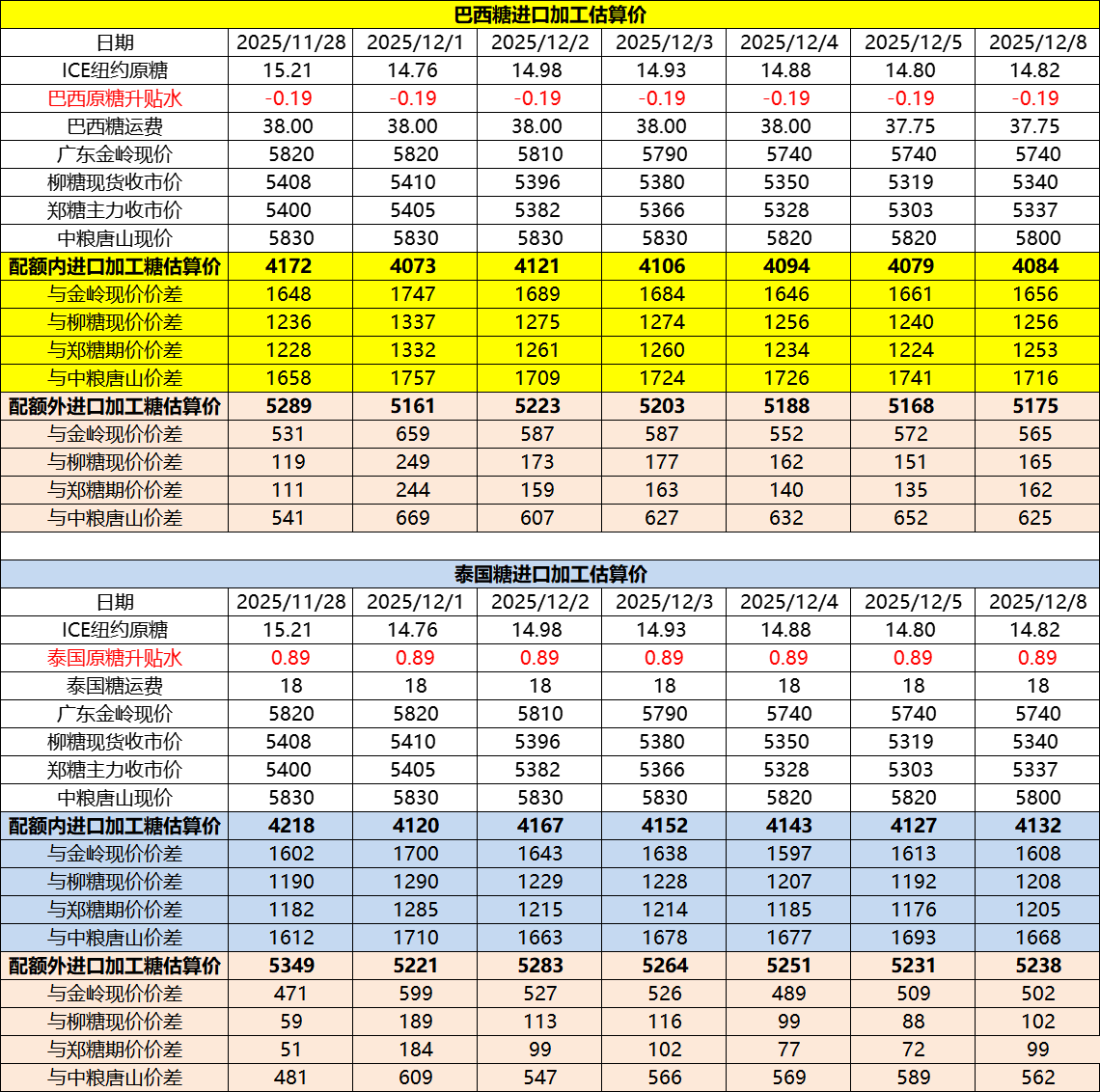 巴西泰国进口糖升贴水、运费及加工成本(12月9日更新)