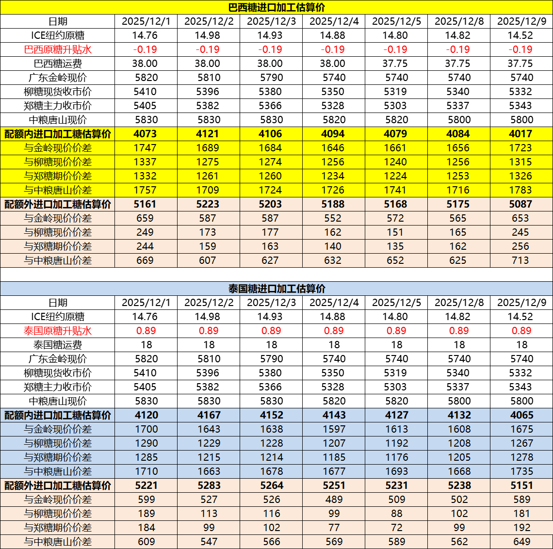 巴西泰国进口糖升贴水、运费及加工成本(12月10日更新)