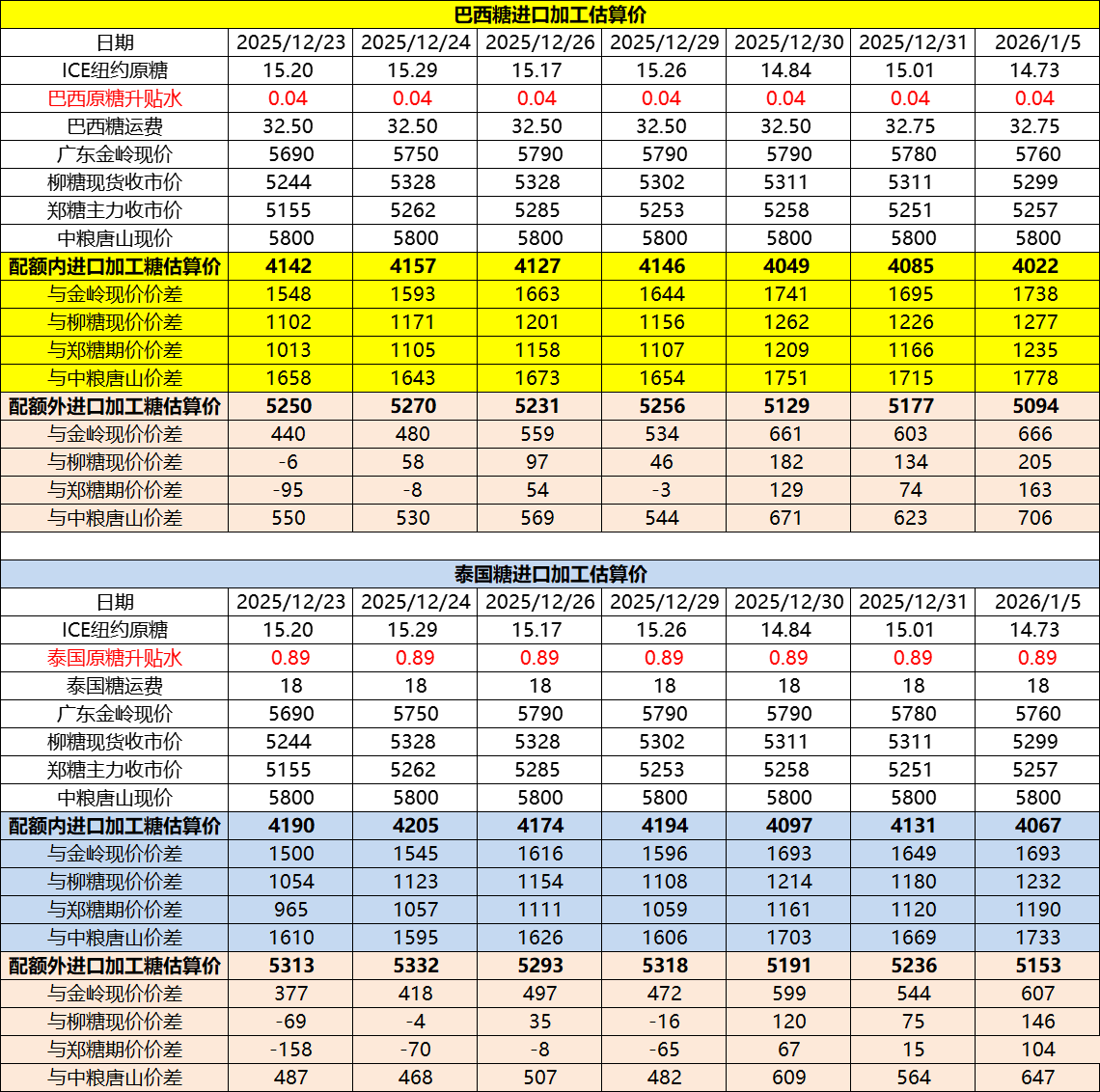 巴西泰国进口糖升贴水、运费及加工成本(1月6日更新)