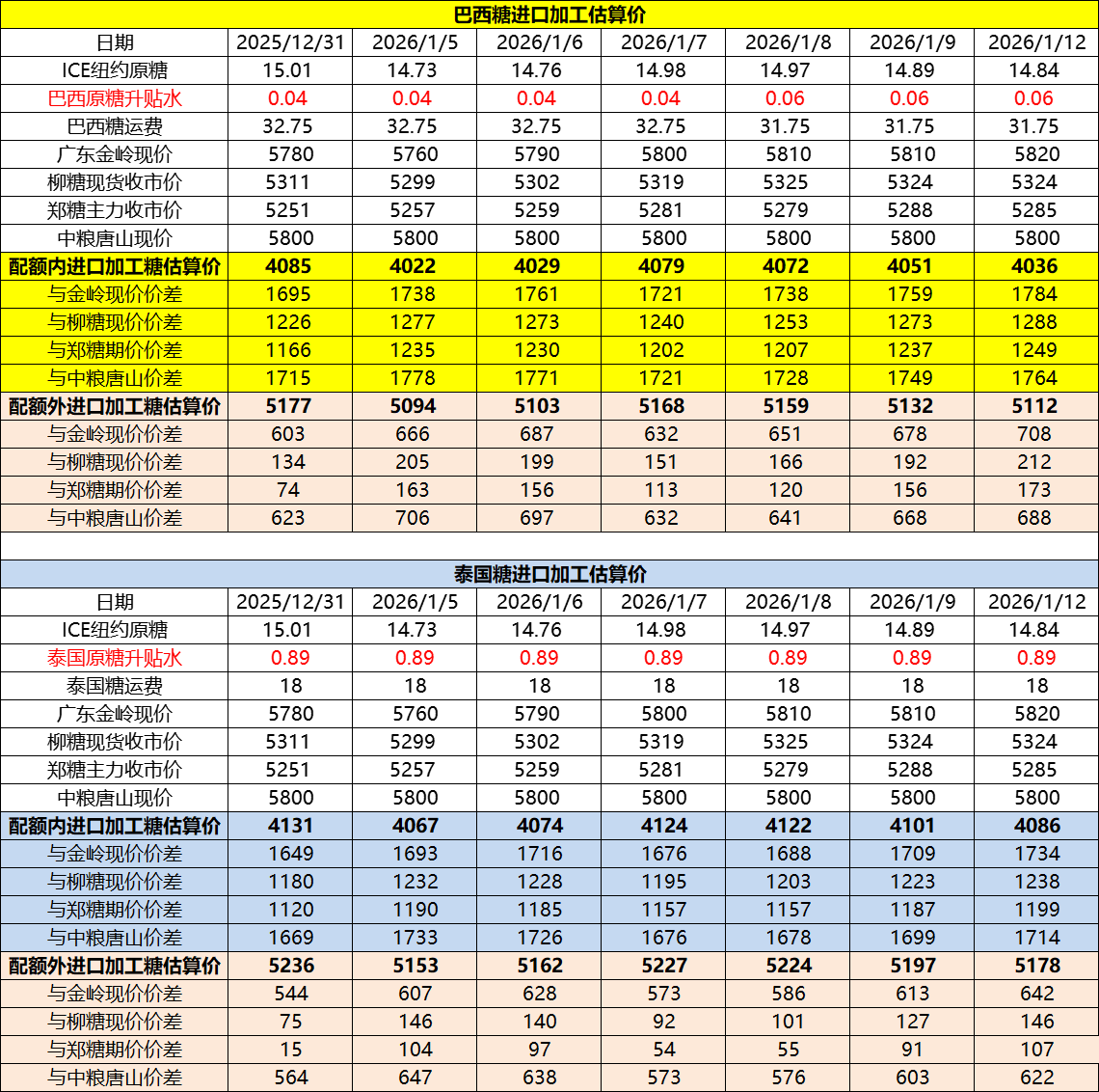 巴西泰国进口糖升贴水、运费及加工成本(1月13日更新)