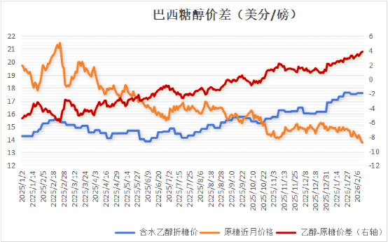 受产量下滑影响,截至1月15日巴西中南部乙醇库存同比下降超20%,加上加油站的乙醇价格较汽油价格更有竞争力,需求保持强劲,巴西含水乙醇折原糖价格近期上涨至约17.6美分/磅的两年半高位。而原糖价格在全球供应过剩压力下不断走弱,乙醇对原糖的价格升水扩大至3.8美分/磅,意味着巴西糖厂生产乙醇的收益显著高于糖。另一方面,糖厂对26/27榨季的糖套保进度较往年同期落后,这种情况下,市场普遍预计4月开始的26/27榨季巴西糖厂将优先考虑生产乙醇而不是食糖。