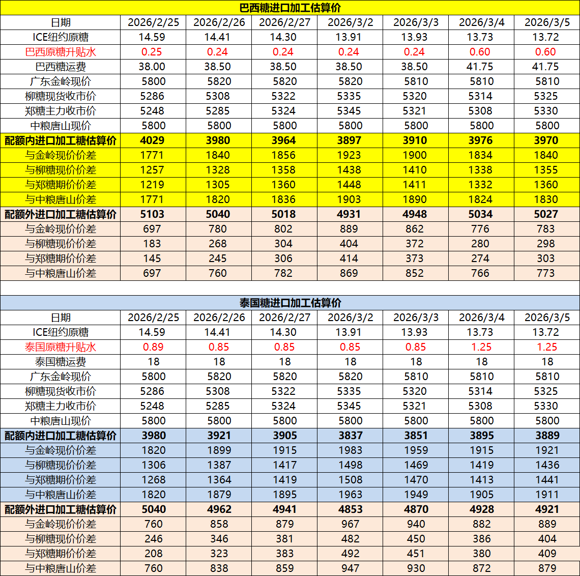 巴西泰国进口糖升贴水、运费及加工成本(3月6日更新)