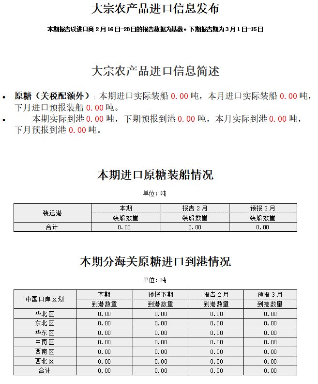 商务部 :2月关税配额外原糖实际到港0吨,3月预报到港0吨